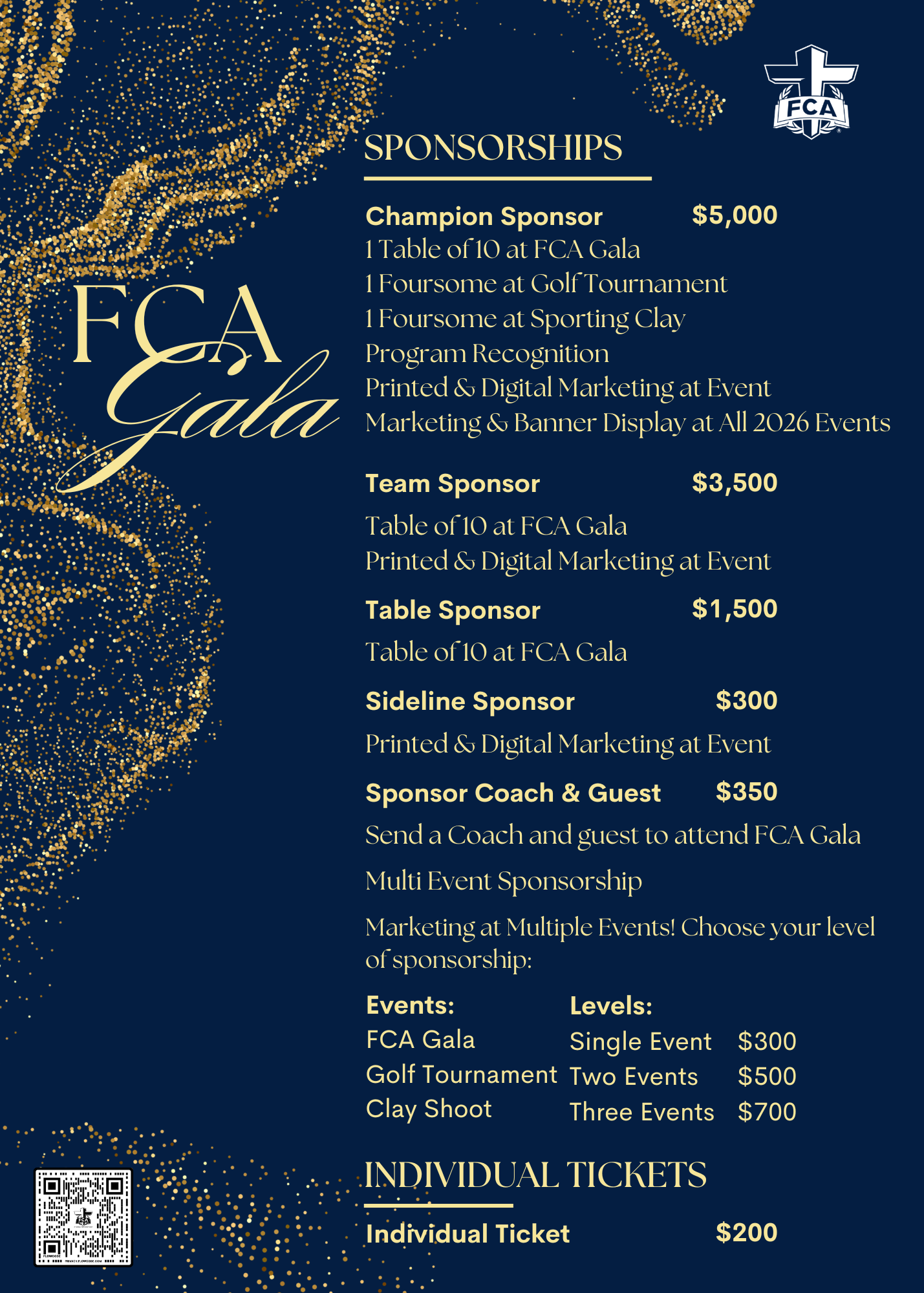 FCA’s mission is to lead every coach and athlete into a growing relationship with Jesus Christ and His church. This gala offers a meaningful opportunity to experience that mission in action through powerful stories, shared community, and a collective commitment to the next generation.